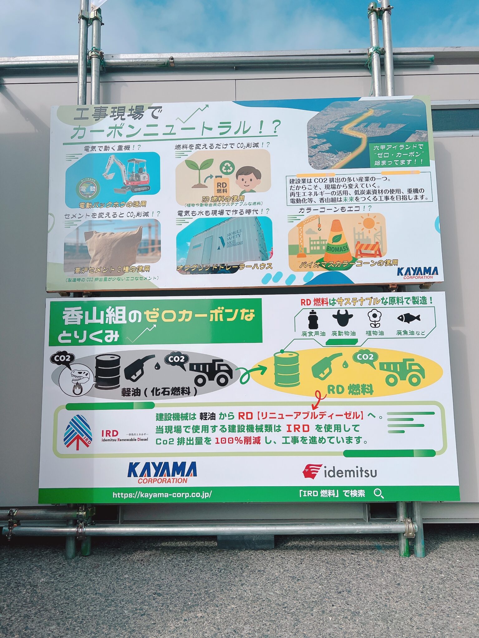 弊社では「ゼロカーボン」を推進しています。「太陽光発電型の現場事務所」をはじめ、「バイオマス樹脂製の三角コーン」、排気ガスを出さない「電動重機」や、「次世代バイオ燃料」を積極的に導入。工事中も地球環境への負荷を減らし、未来に誇れるクリーンな現場環境を実現します。