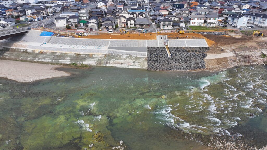 河川の整備や堤防の強化を通じて、 水害から地域を守るための施工を行います。