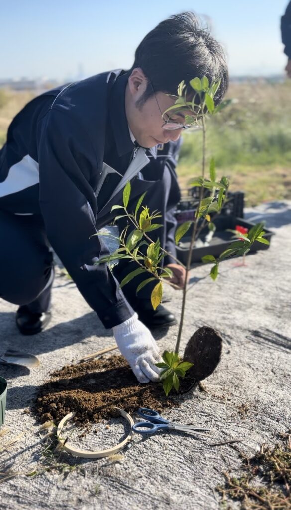 尼崎の森中央緑地パークセンターより苗木を引き取り、本社社屋のベランダで丹精込めて育てています。大きく育った苗木は引き渡しをし、尼崎中央緑地で植樹をします。当社のエリアでは、毎年、除草活動や伐木をする事により、豊かな森になる様に取り組んでいます。