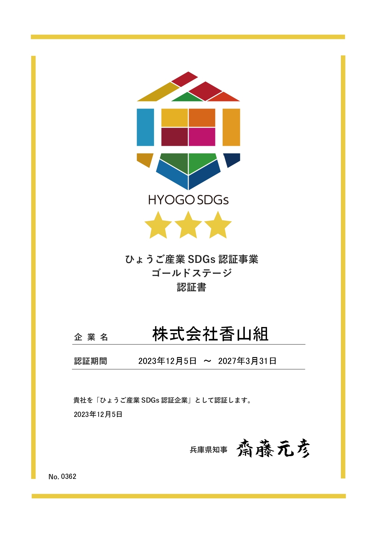 この度、香山組の持続可能な社会への取り組みが評価され、「第1回ひょうごSDGsコンテスト」企業部門において優秀賞を受賞いたしました。今後も地域社会の発展と環境保全に貢献してまいります。